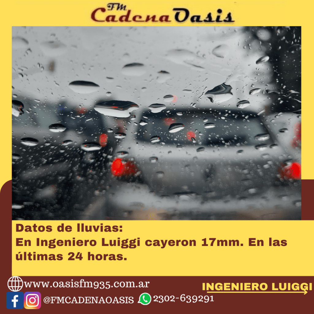 Datos de lluvias: En Ingeniero Luiggi cayeron 17mm. En las últimas 24 horas.