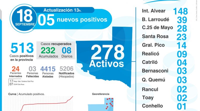 Leer MásTres de los nuevos contagios son en Intendente Alvear y uno en Bernasconi. Todos eran contactos estrechos, que ya estaban aislados. Se
