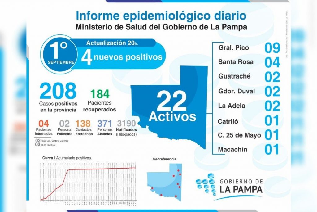 Desde el inicio de la pandemia, en nuestra provincia, se registraron un total 208 casos positivos para COVID-19, de los cuales 22 permanecen activos, 2 han fallecido y 184 se han recuperado. Los casos confirmados activos están distribuidos de la siguiente manera: 4 en la Ciudad de Santa Rosa, 9 en General Pico, 1 en Catriló, 2 en Guatraché, 2 en La Adela, 1 en Macachín, 1 en 25 de Mayo y 2 en Gobernador Duval.