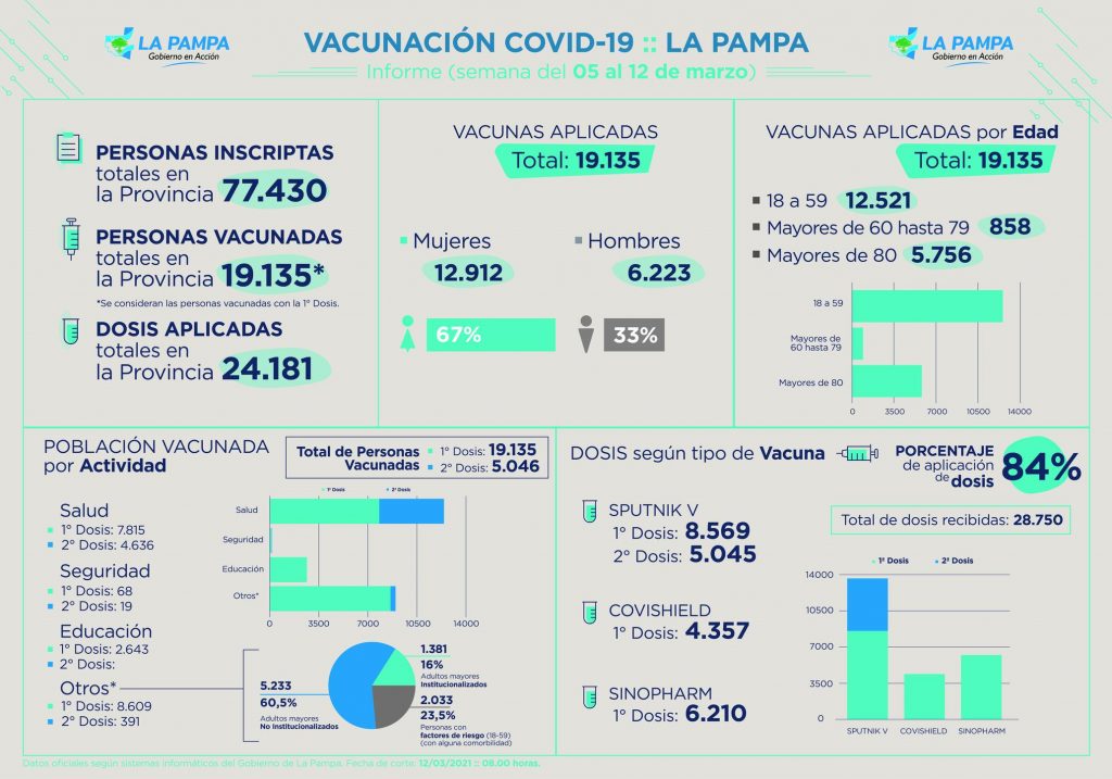 El total de dosis aplicadas son 24.181 (en ese total, 5.046 ya recibieron la segunda vacuna). Hay 77.430 personas inscriptas, a la espera de recibir la vacuna en medio de la pandemia.