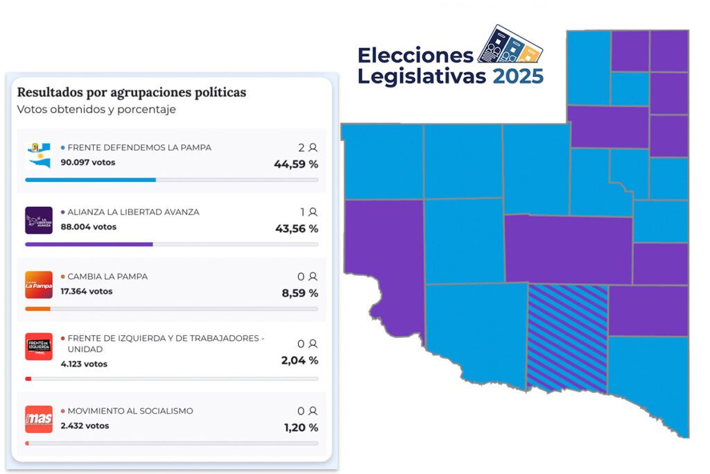 Con una diferencia de apenas 2.093 votos, el oficialismo provincial logró retener dos de las tres bancas en juego, mientras que la fuerza libertaria obtuvo la banca restante. “Cambia La Pampa” quedó como tercera fuerza, muy lejos de la disputa principal.