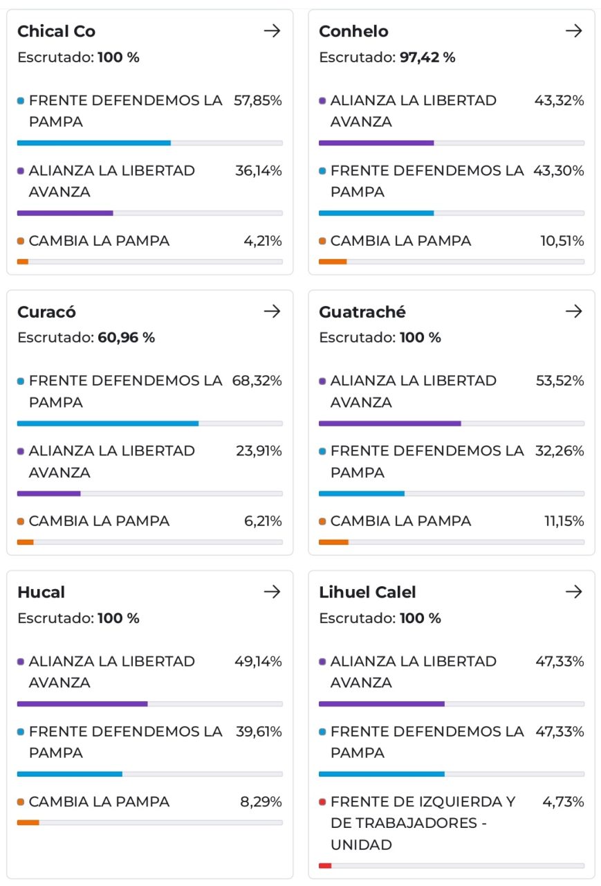 El resultado general se construyó sobre una fuerte paridad territorial. El Frente Defendemos La Pampa logró la victoria en 12 de los 22 departamentos, mientras que Alianza La Libertad Avanza se impuso en los 10 restantes.