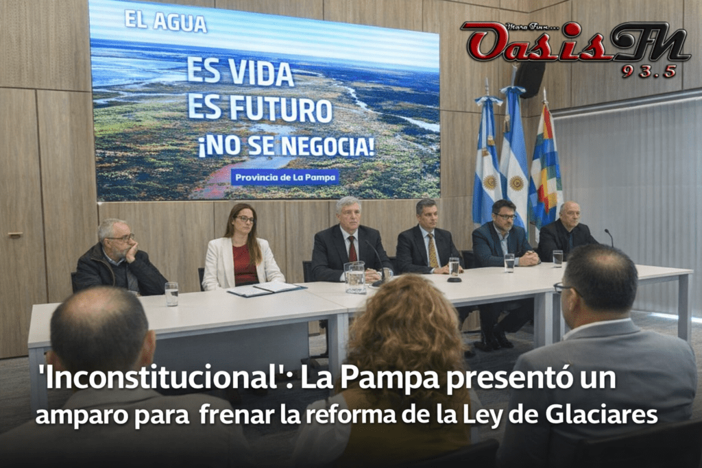 El gobernador Sergio Ziliotto, junto a autoridades de la Universidad Nacional de La Pampa (UNLPam), dirigentes de la Fundación Chadileuvú y de la Asamblea por los Ríos Pampeanos, anunció este jueves la presentación de un amparo ambiental ante la Justicia Federal para declarar la inconstitucionalidad de la reforma de la Ley de Glaciares (26.639).