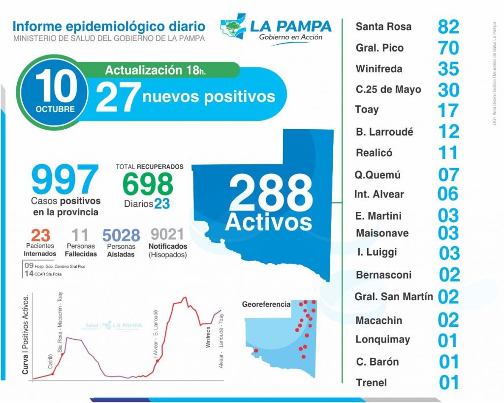 El Gobierno de la provincia de La Pampa, a través del Ministerio de Salud, comunicó que en horas de la tarde del día 10 de octubre se finalizó con el procesamiento de 134 muestras en los laboratorios de la Dirección de Epidemiología y del hospital Gobernador Centeno y Lucio Molas, de las cuales 27 resultaron positivas para COVID-19.