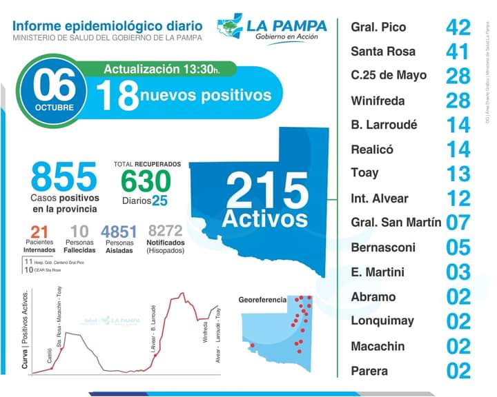 De las personas confirmadas como positivas 4 son residentes en la ciudad de Santa Rosa, 5 en General Pico, 3 en Realicó y 6 en Winifreda. De los 18 casos confirmados, 16 se encontraban aislados por ser considerados contactos estrechos y 2 casos continúan en investigación epidemiológica.